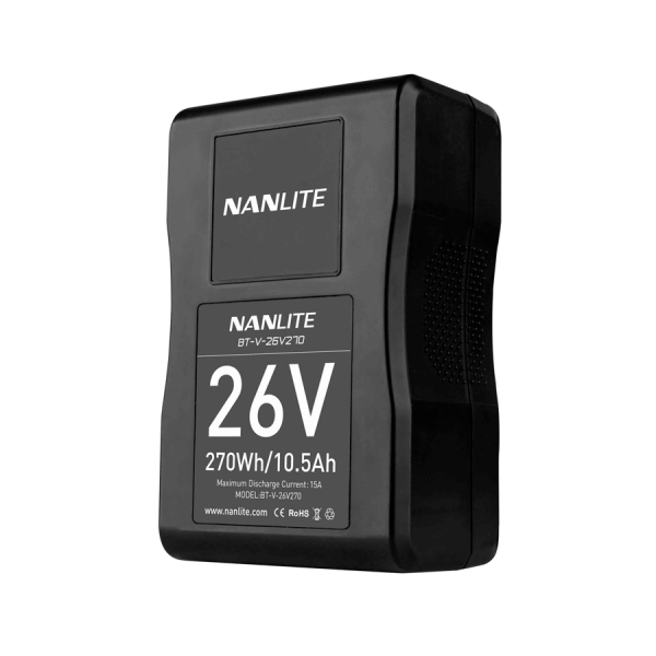 La Nanlite batterie V-Mount Li-Ion BT-V-26V270 fournit une alimentation puissante et fiable pour les équipements haute intensité comme les projecteurs Forza 500 et MixPanel 150, avec une capacité de 270Wh, un courant de 12A et une compatibilité avec les chargeurs 26V.