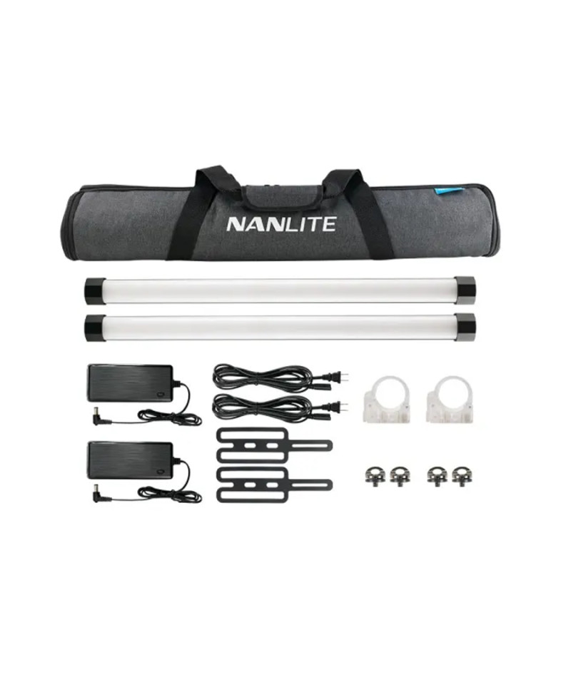 Le kit Nanlite PavoTube II 15X comprend 2 tubes LED RGBWW 35W de 61 cm avec contrôle des pixels, CCT 2700K-12000K, CRI 97/TLCI 98 et batterie intégrée. Connectivité DMX, Bluetooth et 2.4G, 36 000 couleurs, 15 effets classiques et 10 effets pixels pour un éclairage créatif, robuste et autonome.
