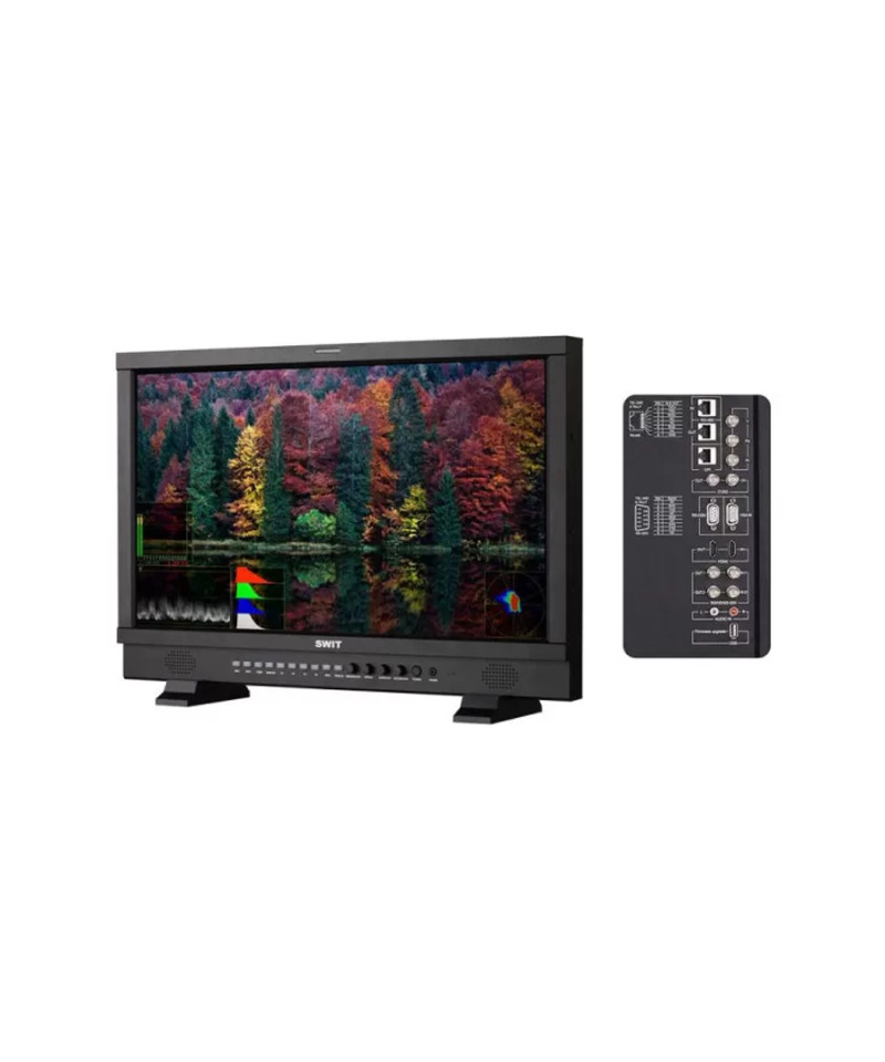 SWIT S-1243F : moniteur studio 23,8″ Full HD IPS (1920×1080, 1000:1, 1000 nits, 178°). Entrées/sorties 12G/3G/HD/SD-SDI, HDMI, YUV, VGA, CVBS. Outils avancés (waveform, vectorscope, histogram, audio 16 ch, LUT), tally 3 couleurs, contrôle GPI/UMD, alimentation AC, V-Mount ou Gold Mount.